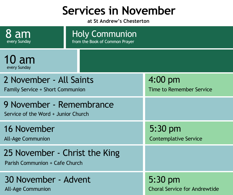 Our 10 am services in church are on the 2nd (Family Service followed by Short Communion), 9th (Service of the Word followed by an Act of Remembrance), 16th (All-Age Communion), 23rd (Parish Communion) and 30th (All-Age Communion). In addition to these services, in St Andrew’s Hall there will be Junior Church Groups on the 9th and Café Church on the 23rd.