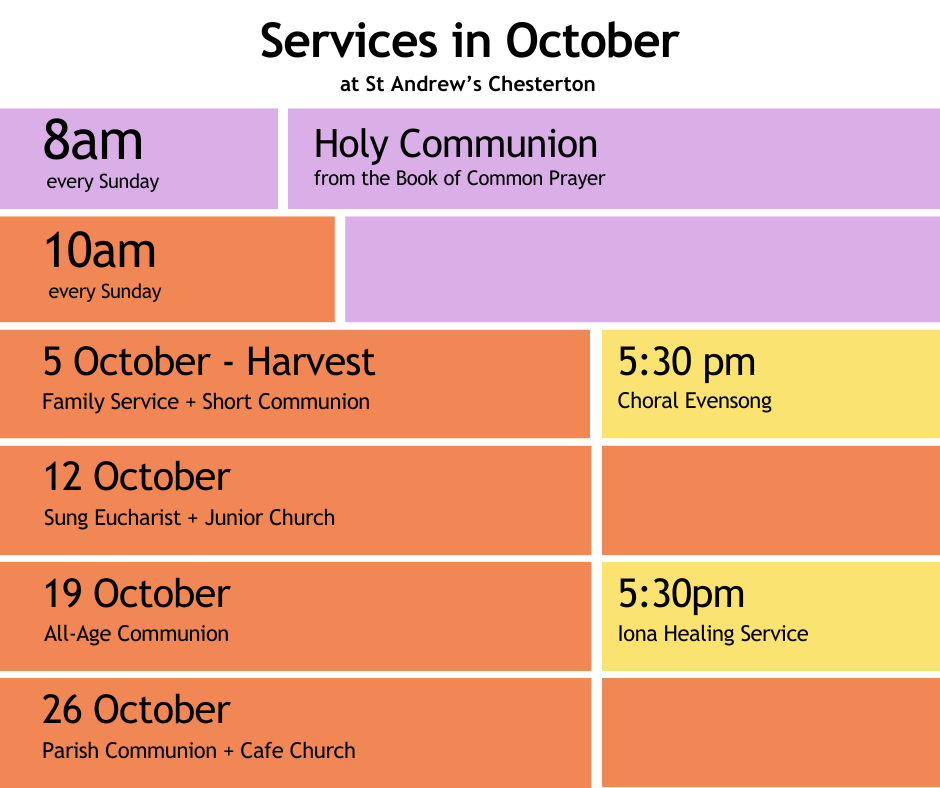 With the cooling of the air, October has made itself known. I can think of no better way to start the month than with our annual Harvest Festival Family Service at 10 am on 5 October. Following this, there will be a Short Communion at c. 11:15 am and a bring-and-share lunch. Then, in the evening, there will be Choral Evensong at 5:30 pm.