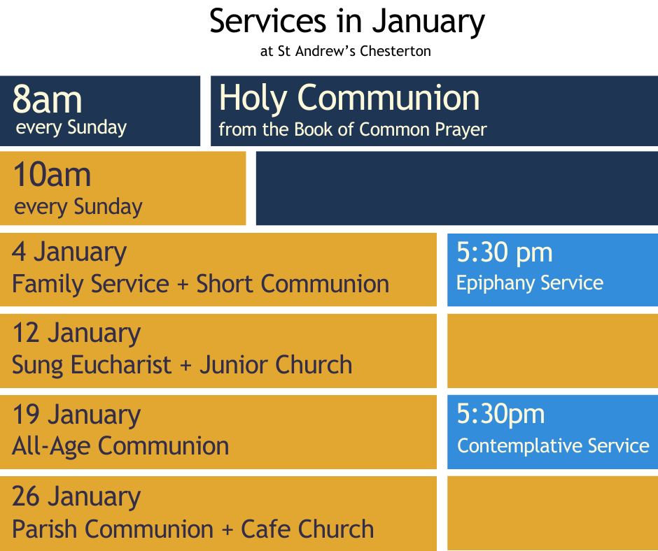 Our 10 am services will return to their usual pattern: Family service followed by Short Communion (4 January), Sung Eucharist with Junior Church in St Andrew’s Hall (12 January), All-Age Communion (19 January), and Parish Communion with Cafe Church in St Andrew’s Hall (26 January).