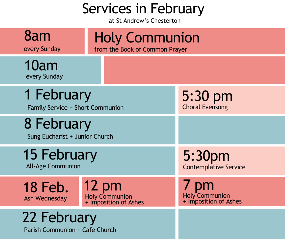 Following our regular 8 am BCP service each Sunday is our weekly 10 am service. On the 1st is our Family service followed by Short Communion (c. 11:15). Sung Eucharist and Junior Church (in St Andrew’s Hall) is on the 8th. On the 15th is All-Age Communion and on the 22nd is Parish Communion and Cafe Church (in St Andrew’s Hall).